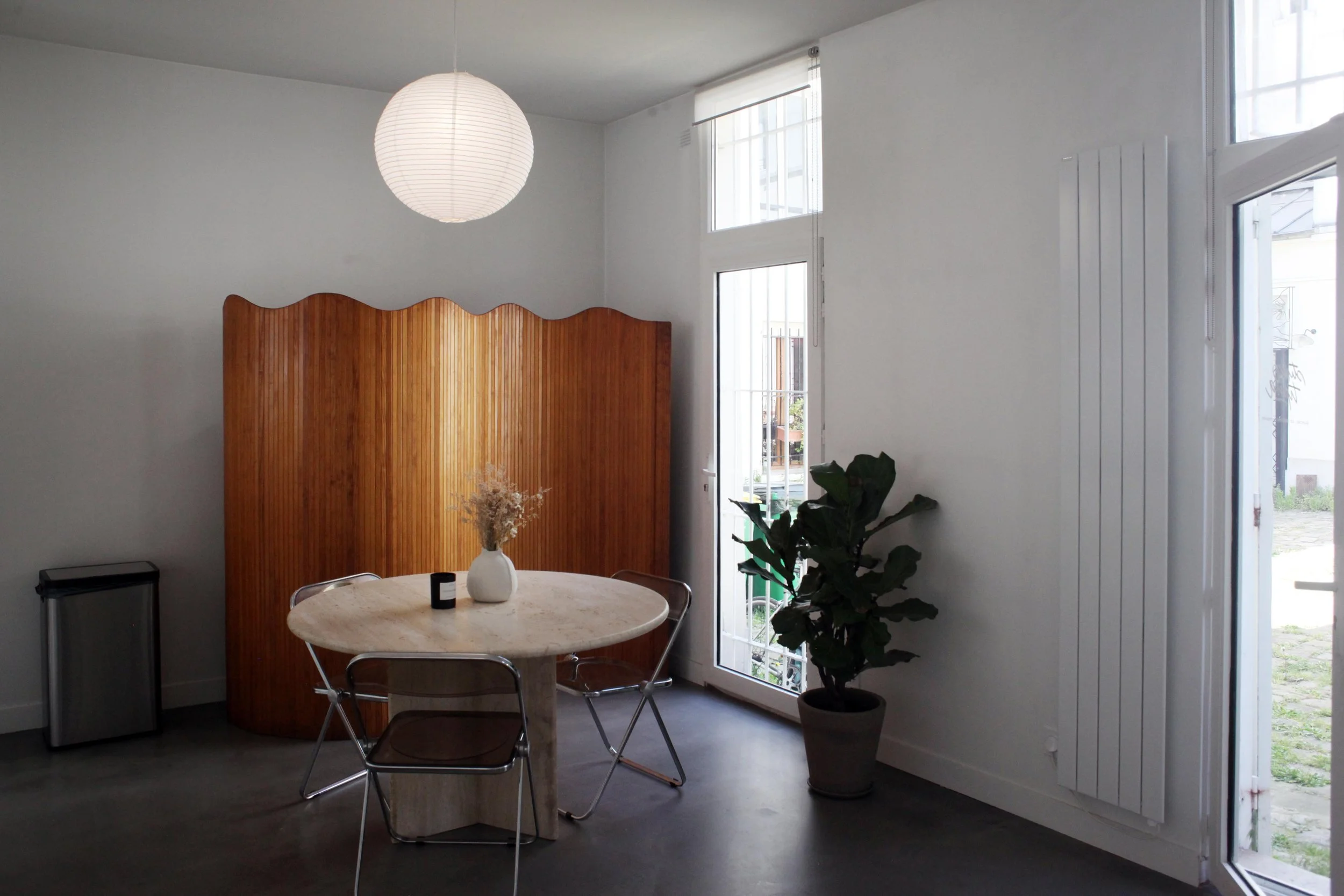 Au sol un béton coulé vernis, une verrière et des menuiseries sur mesure viennent habiller ce studio situé dans le 10ème arrondissement de Paris.
